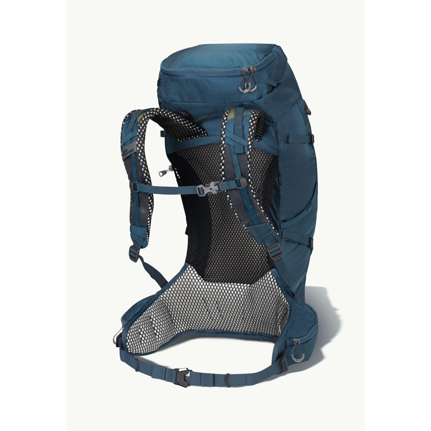 Las numerosas opciones de almacenamiento incluyen bolsillos de malla elástica en la parte delantera y en los laterales, así como presillas para fijar bastones de trekking. Los objetos pequeños pueden guardarse en el bolsillo interior con solapa. La mochila también está equipada con un sistema de hidratación.
