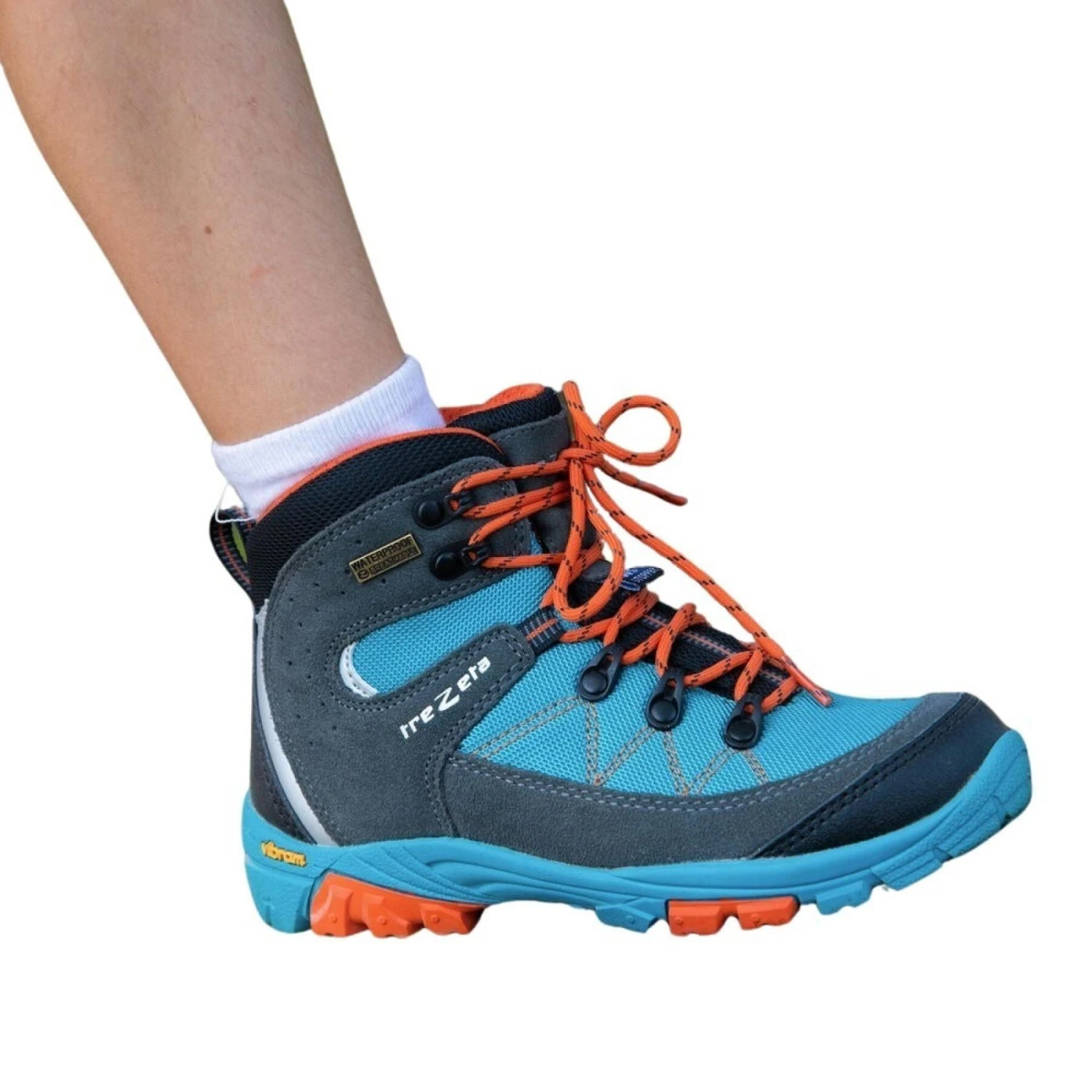 Cyclone WP Kid/Jr, una bota de senderismo desarrollada teniendo en cuenta la anatomía del pie de los niños. Fabricada con una parte superior de ante y textil con inserciones de microfibra y tecnología Trezeta® Water Stopper.